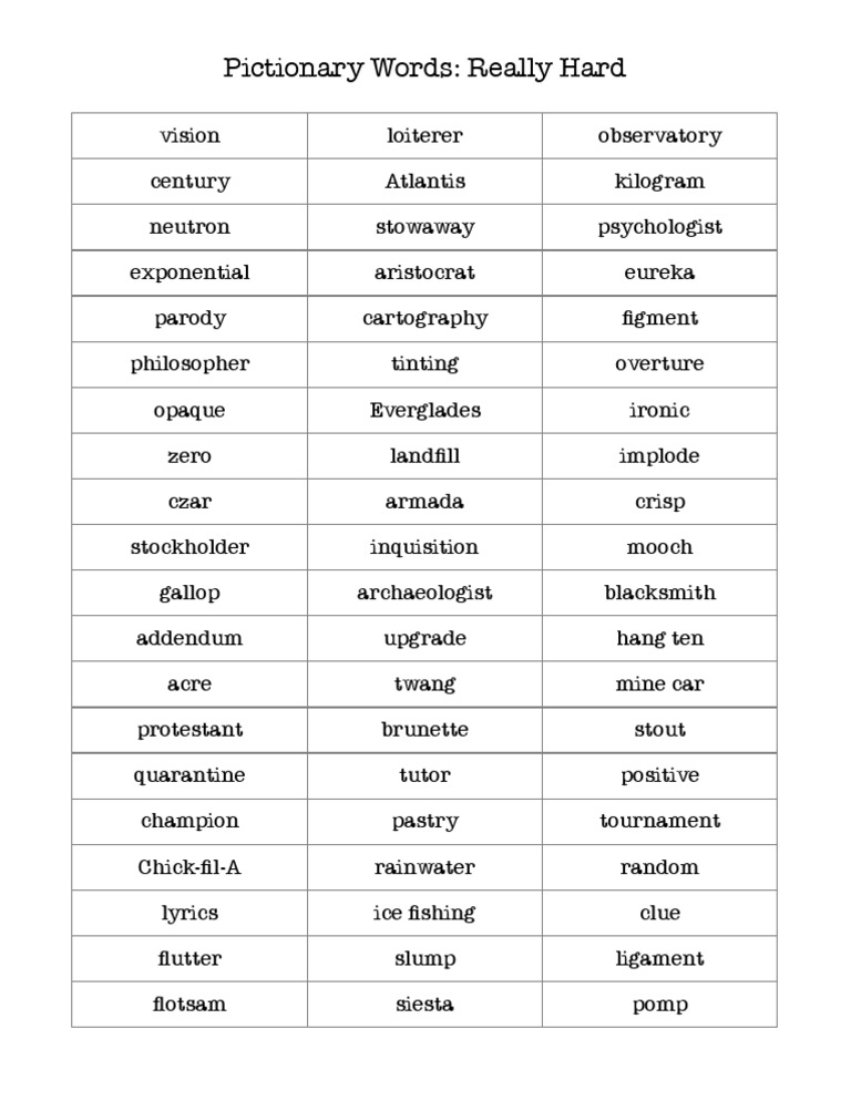 List Of Pictionary Words Hard Difficulty Pictionary Words Pictionary Word List Pictionary